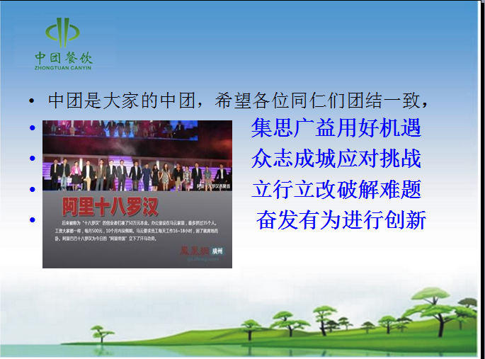 | 本文來源:網(wǎng)絡 發(fā)表日期:2015-2-2 | 2014年11月27日李克強總理在國務院會議上提出2015年需“大膽創(chuàng)新,提倡服務外包”這給我們第三產(chǎn)業(yè)帶來了政策的春風。借此時機,中團人蓄勁待發(fā),于2015年1月28日公司開展工作計劃交流會,會議講述中團的創(chuàng)業(yè)史,中團發(fā)展史,最后圍繞著“中國情、中團夢”而展開。確定了中團未來的發(fā)展方向,吹響了中團發(fā)展、創(chuàng)新的號角。中團人將"成為中國團膳最優(yōu)秀的企業(yè)"的使命不懈努力!感恩一直以來關心、幫助、支持、關注中團發(fā)展的新老朋友!